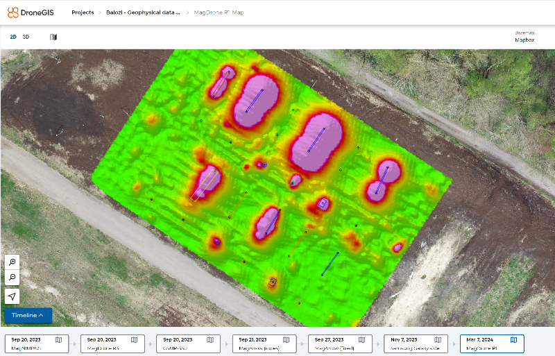 Note, that general rule with magnetometer when it is necessary to detect artificial objects or artefacts – fly as low as possible. Recommended altitude for the tasks like UXO search – 1m above surface or even lower. That means that drone should be equipped with terrain following system (included in recommended magnetometer bundle).